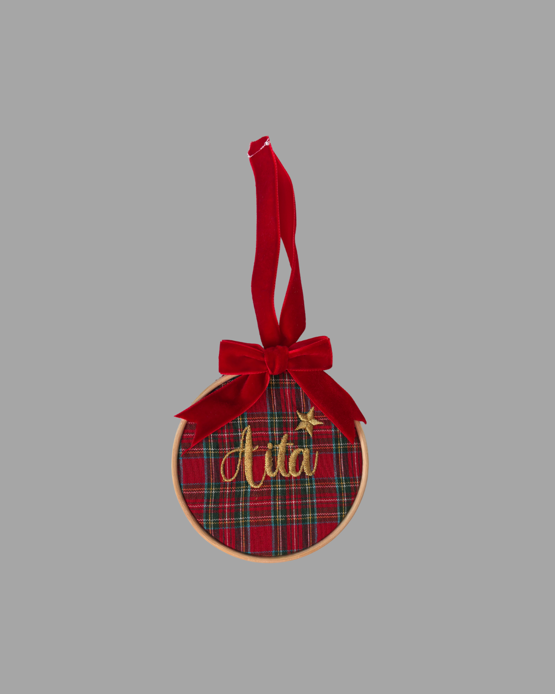 Este elegante adorno navideño está elaborado con un aro de bordado de madera que enmarca una tela cuidadosamente seleccionada, disponible en distintos colores y texturas según el gusto del cliente. En el centro, se personaliza con un nombre bordado en hilo del color que elijas (dorado, plateado, rojo, verde, blanco, entre otros), acompañado de un delicado detalle decorativo como una estrella o copo de nieve.