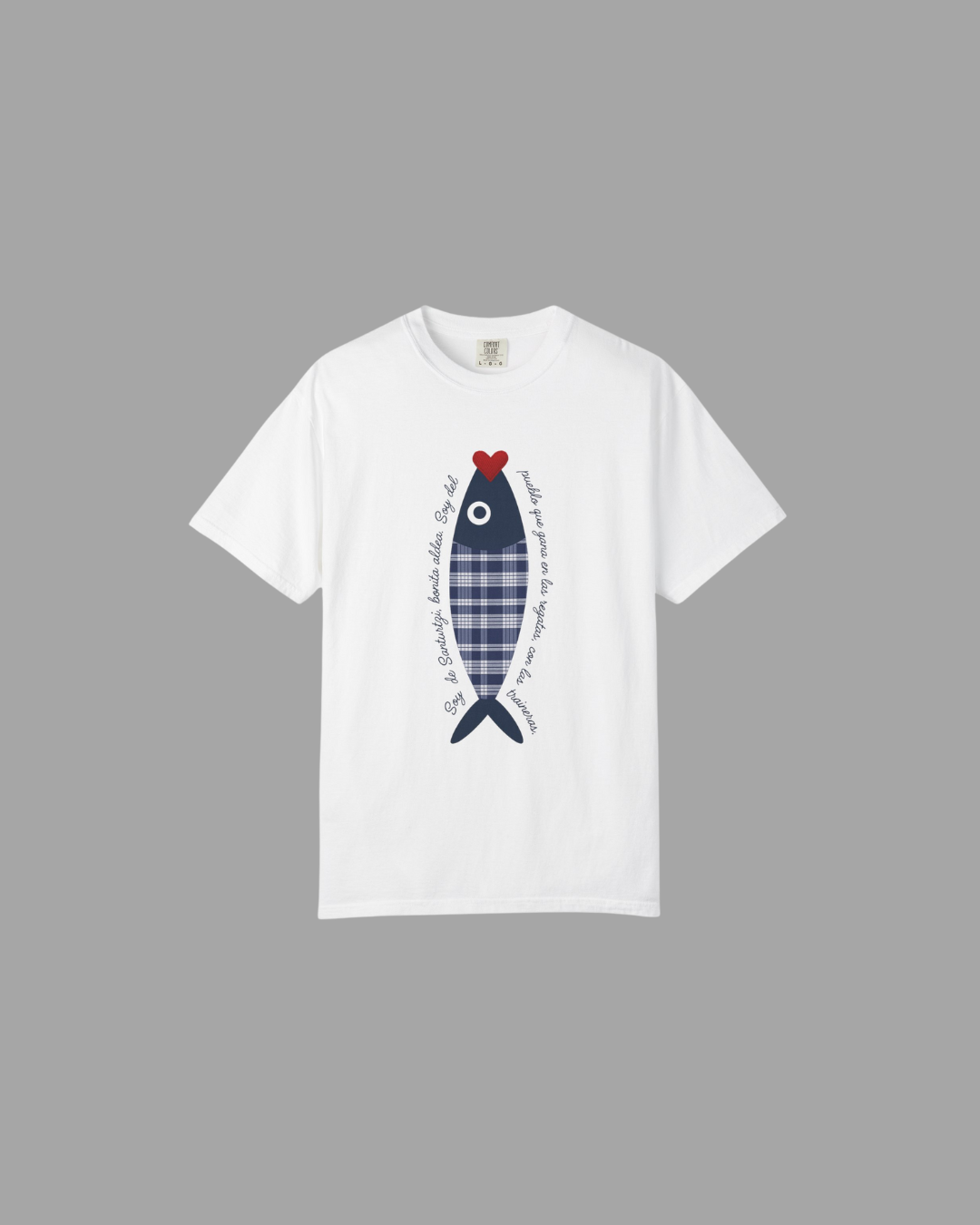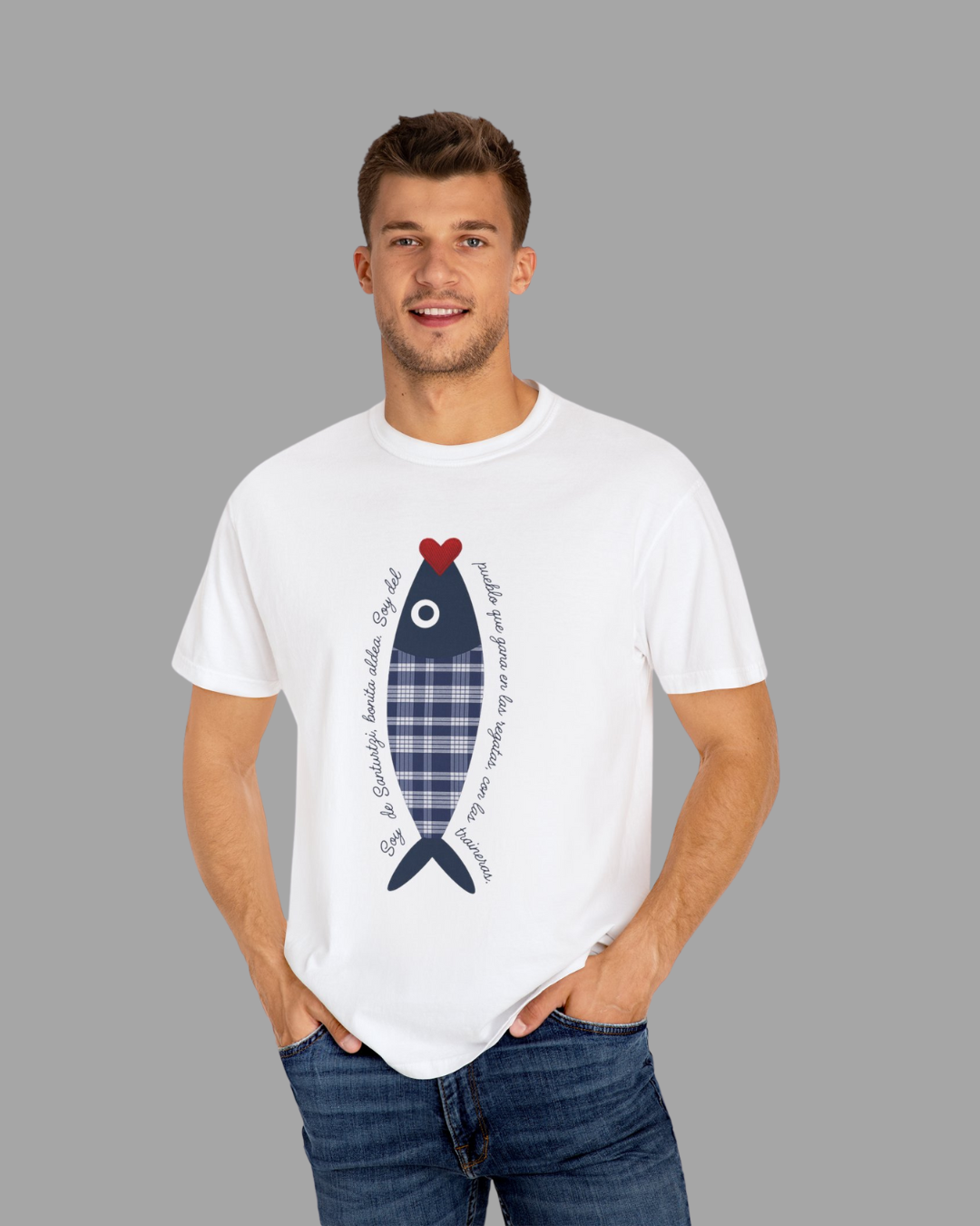 En el centro, una simpática sardina con cuerpo de tela a cuadros, típico de la ropa del arrantzal, simboliza la conexión con el mar y la cultura local. La rodea una frase que dice: