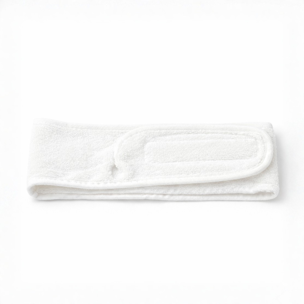La cinta de pelo está fabricada en tejido de toalla con cierre de velcro, lo que permite un ajuste cómodo y seguro durante la rutina facial, manteniendo el cabello perfectamente recogido.