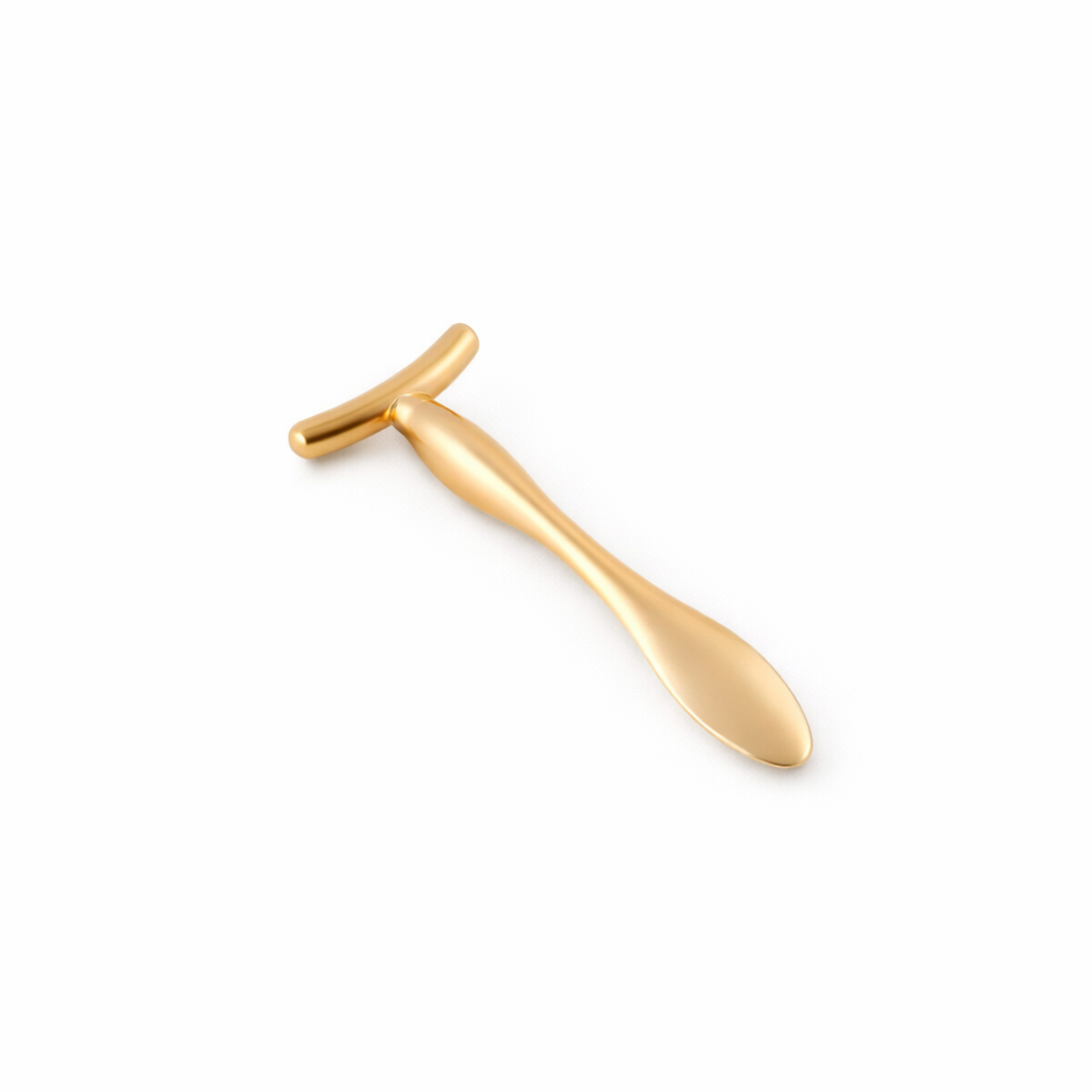 El set incorpora un masajeador de ojos fabricado en zinc con acabado mate, que ayuda a estimular la zona del contorno ocular, favoreciendo la relajación y la sensación de frescor.